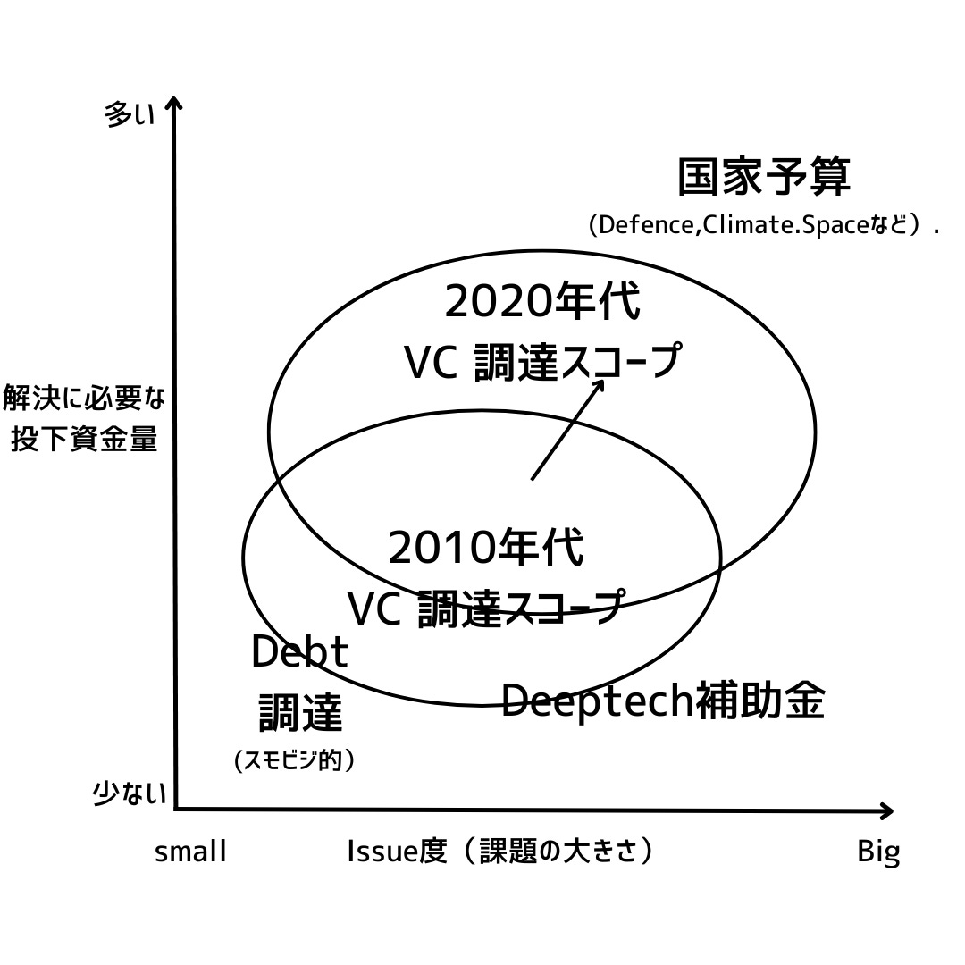 前回記事でスタートアップ/VCが解くことができるIssue/課題が大きくなってきているのではないかということは記載した。下記図のように、よりファンドサイズなどスタートアップに流れるお金の総量が増えることによって、解決できうるIssueが10年前と比較すると大きくなってきているというのはわかりやすいであろう。
