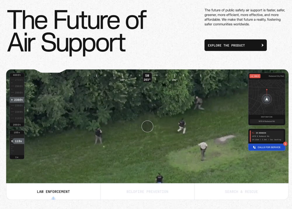 事業内容: 元警察官が立ち上げた。警察の人手不足に対応。自動ドローンシステムにより、3分以内に事件現場に到達することを目標。ライブ映像で、先にドローンがつき事件の現場の撮影などを行う。ドローンには地上レーダー、無線周波数センサー、遠隔IDデータが搭載。