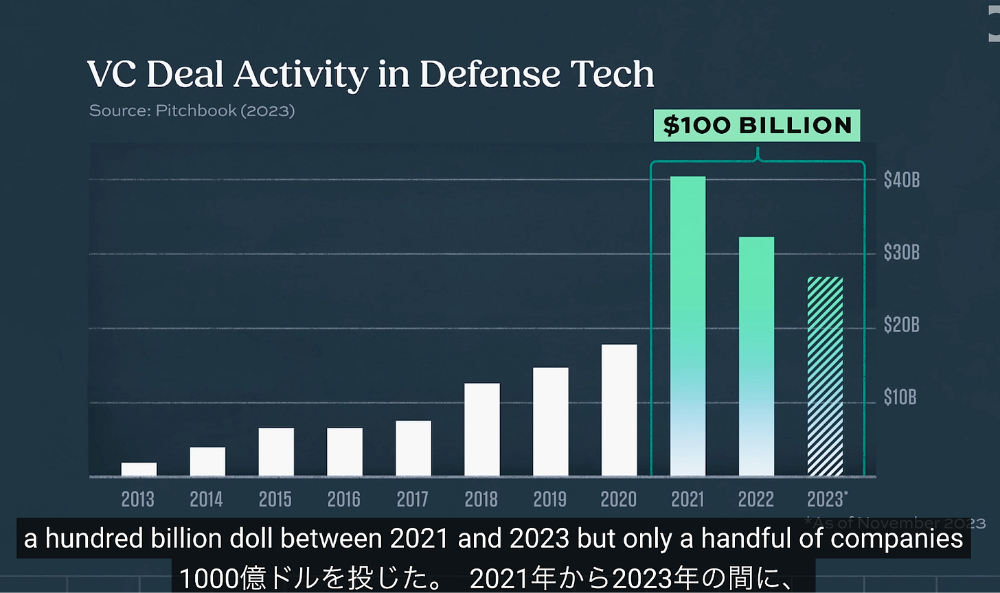 後述するが、その中でユニコーンなどのような企業は多くでてきている、古くはPalantirのようなものから、現在はAndurilみたいなところまで多くのスタートアップが生まれてきている。直近ではAndurilは高い評価額で調達をしかけている。実際にこの数年でベンチャーキャピタルからの出資は多くこの領域に向けられている。